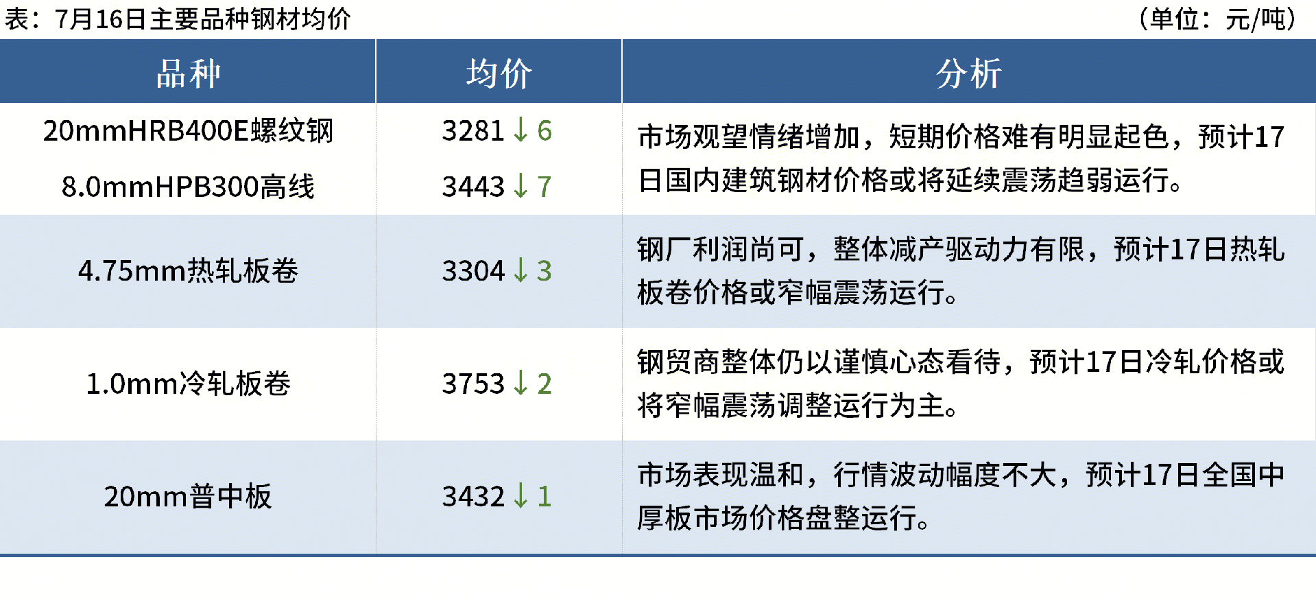 ◎7月16日,全國主港鐵礦石成交100.00萬噸,環(huán)比減1.5%;237家主流貿易商建筑鋼材成交8.74萬噸,環(huán)比增1.3%。