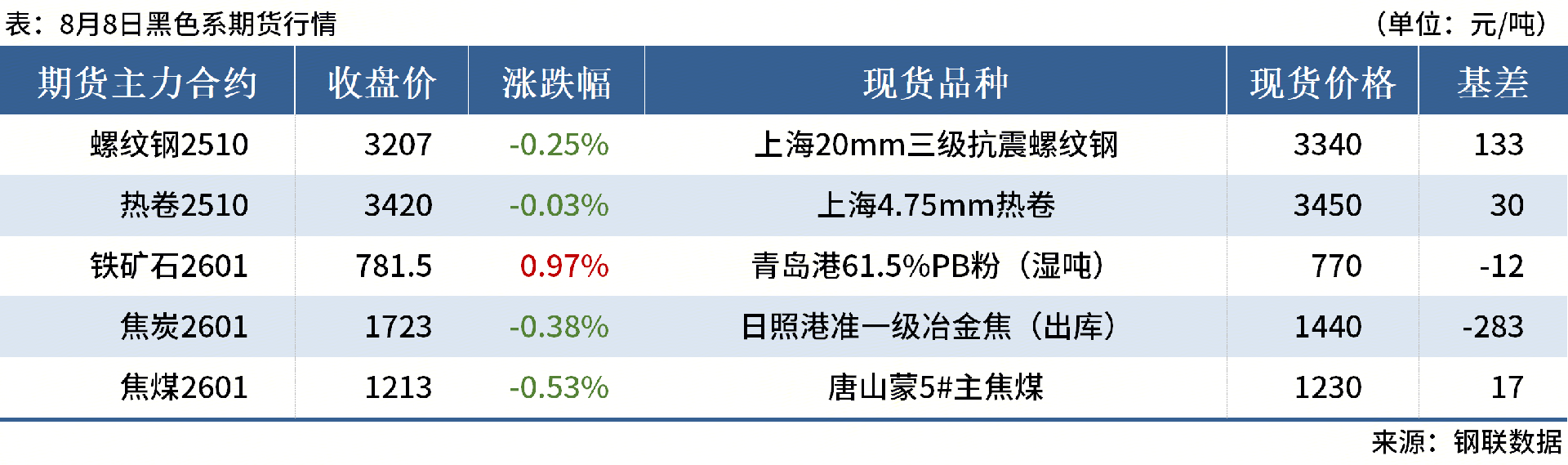◎8月8日,全國主港鐵礦石成交69.70萬噸,環(huán)比減35.8%;237家主流貿(mào)易商建筑鋼材成交9.36萬噸,環(huán)比減3.5%。
