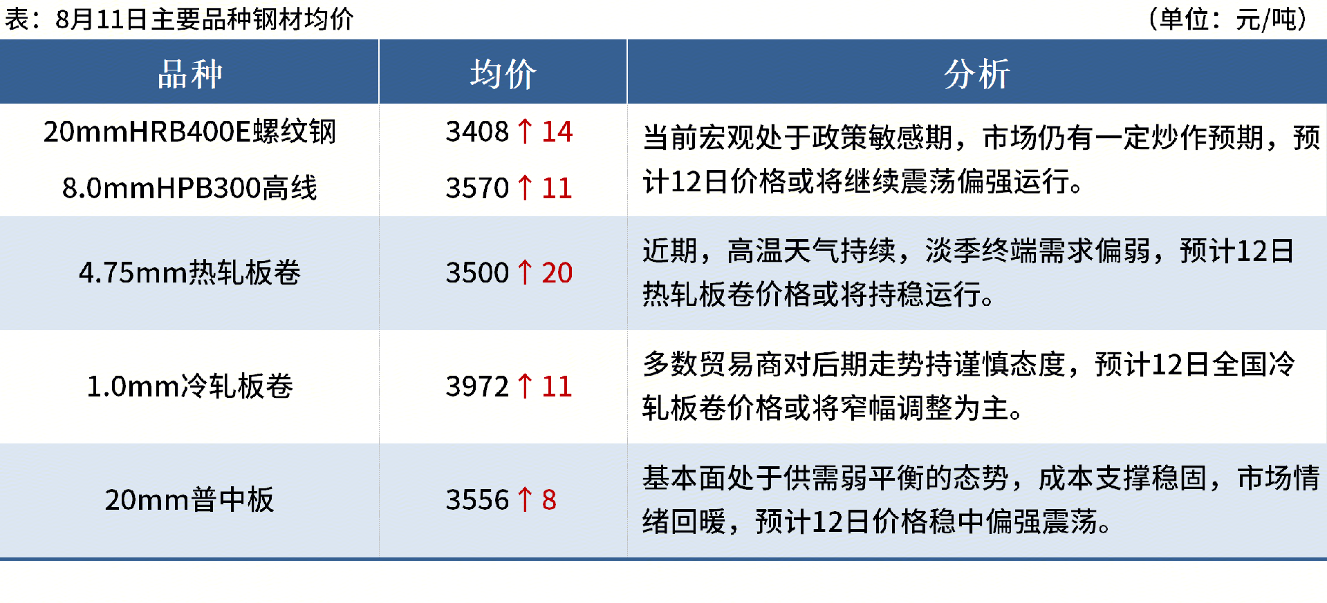 ◎8月11日,寶鋼9月冷熱軋調(diào)價(jià),厚板、熱軋基價(jià)上漲200元/噸;酸洗、普冷基價(jià)上漲300元/噸。詳情>>