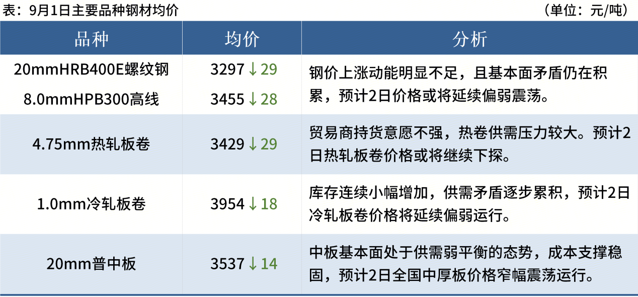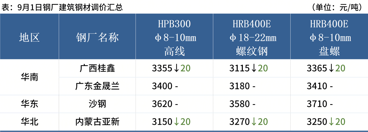 ◎ 9月1日,沙鋼出臺9月上旬出廠價,螺紋鋼、線材、盤螺價格持平,現螺紋鋼3550元/噸,盤螺3710元/噸。