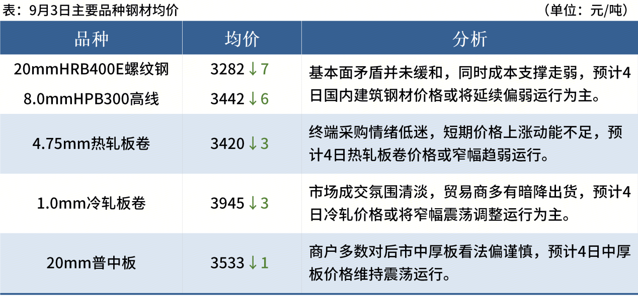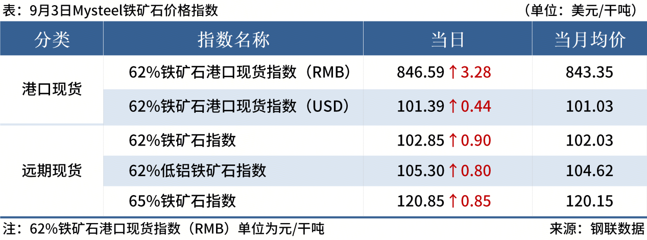 ◎ 9月3日,全國主港鐵礦石成交86.40萬噸,環(huán)比減4%;237家主流貿易商建筑鋼材成交8.22萬噸,環(huán)比減17%。