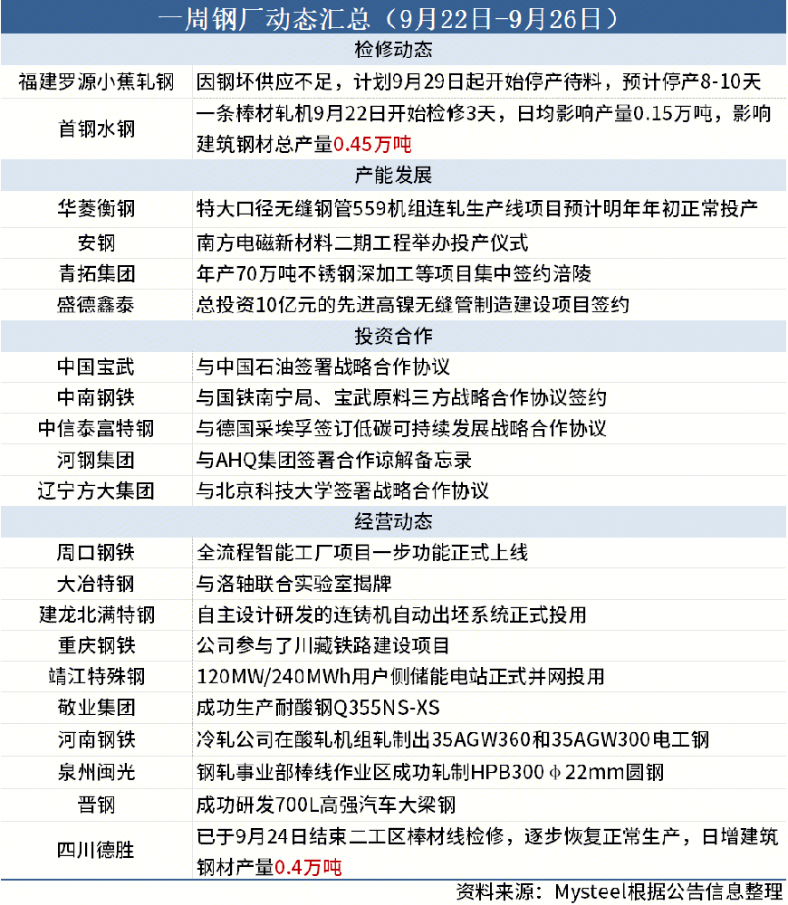 據(jù)Mysteel不完全統(tǒng)計(jì),本周(9月22日-9月26日)2家鋼廠發(fā)布檢修信息,具體如下: