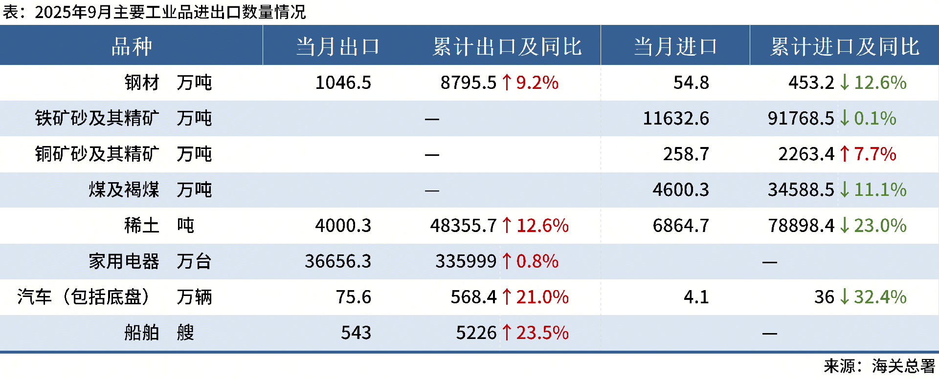 ◎ 海關(guān)總署:9月中國出口鋼材1046.5萬噸;1-9月累計出口鋼材8795.5萬噸,同比增長9.2%。其他主要工業(yè)品進(jìn)出口情況如下: