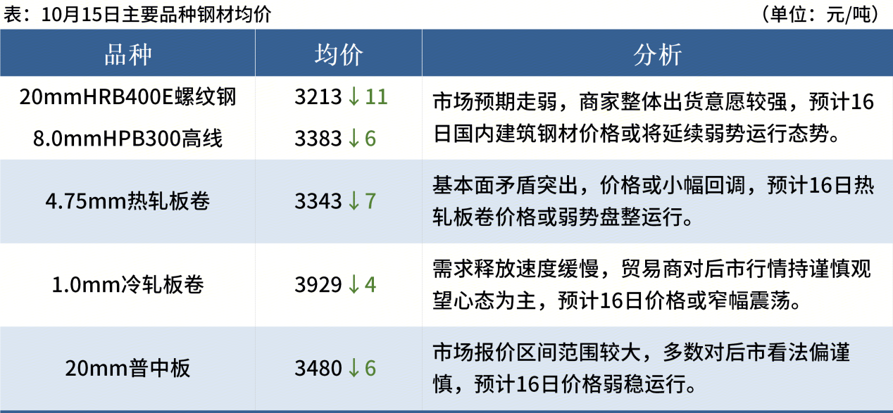◎ 10月15日,全國主港鐵礦石成交124.40萬噸,環(huán)比減33.1%;237家主流貿(mào)易商建筑鋼材成交9.14萬噸,環(huán)比減3.4%。