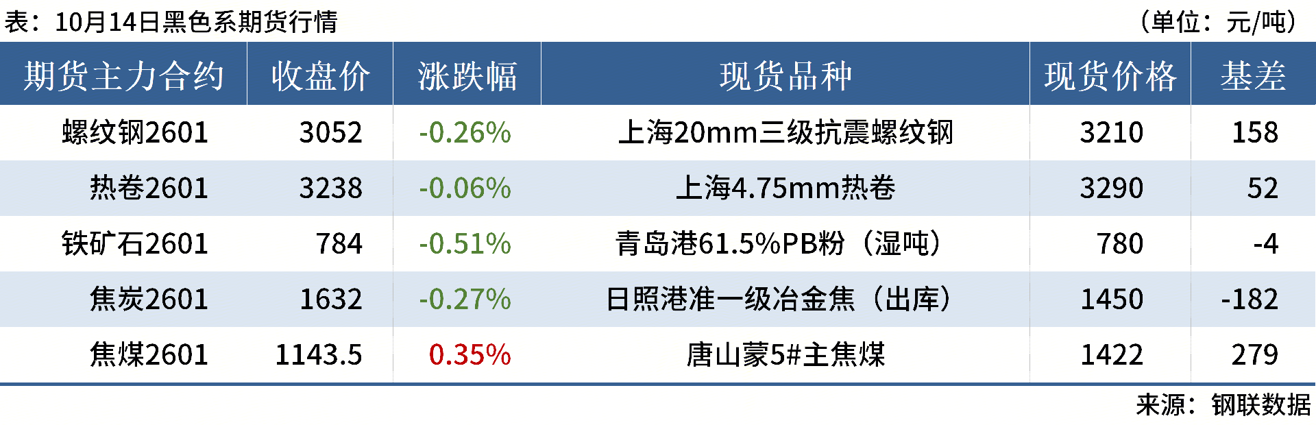 ◎ 10月14日,全國主港鐵礦石成交185.90萬噸,環(huán)比增95.3%;237家主流貿(mào)易商建筑鋼材成交9.46萬噸,環(huán)比減10.8%。